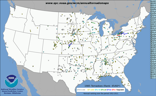 Citation Linkwww.spc.noaa.govhttp://www.spc.noaa.gov/wcm/annualtornadomaps/1985.png